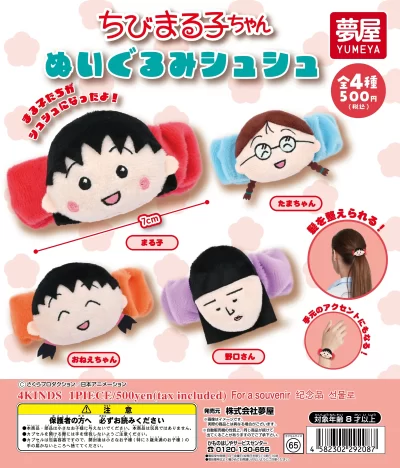 ちびまる子ちゃんの人気キャラクターがシュシュなったよ!髪をまとめたり、腕につけたり、ぬいぐるみ付きなのでおしゃれ度アップ間違いなし!